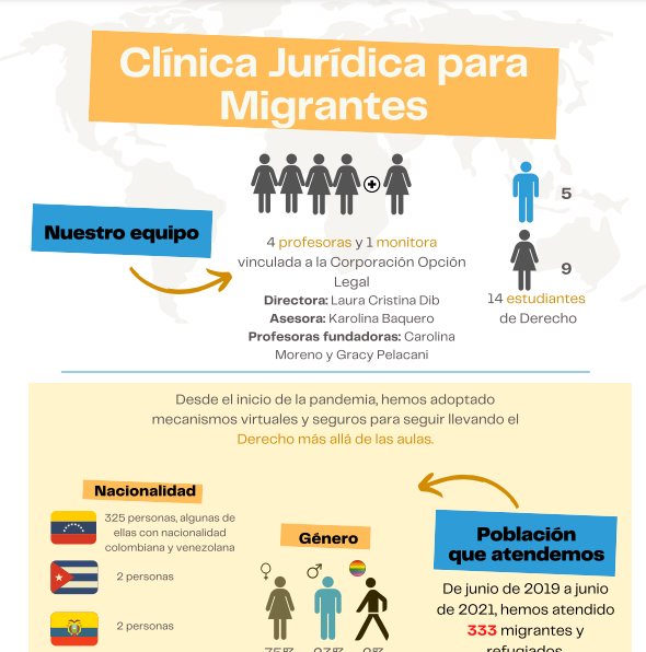 La Clínica Jurídica para Migrantes surgió inicialmente como una línea de trabajo del Consultorio Jurídico de la Universidad de los Andes, a fin de responder a las necesidades jurídicas insatisfechas de las personas migrantes, refugiadas y retornadas, sobre todo, provenientes de Venezuela. Sin embargo, la demanda de servicios jurídicos por parte de la población migrante continuó en aumento. Este incremento permitió que el consultorio comprendiera la complejidad de los retos que implica dar atención legal a la población migrante. Entonces surgió la necesidad de crear una clínica jurídica especializada en el fenómeno migratorio, capaz de diseñar, articular e implementar distintas estrategias jurídicas para responder a este fenómeno social complejo.